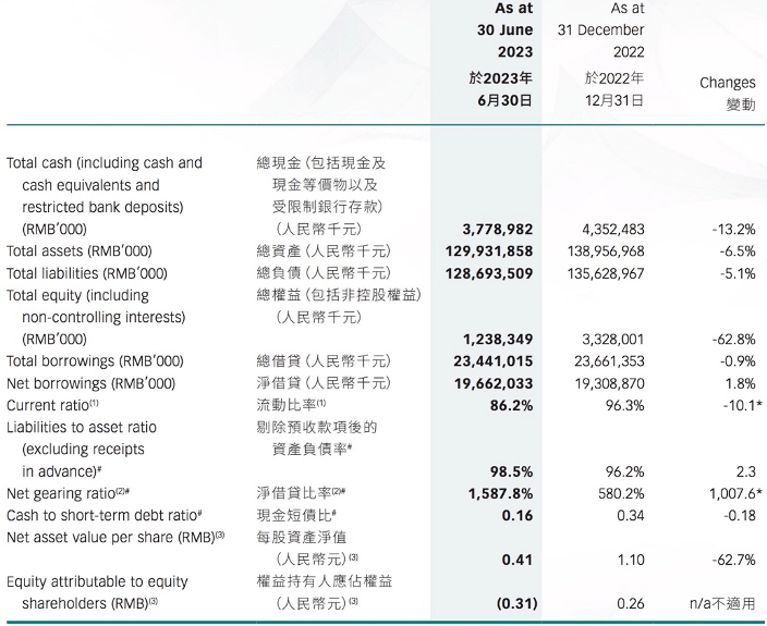 建业地产出现债务问题已有不短时日,目前情况仍不乐观。据财报数据披露,今年上半年,该公司现金短债比、净负债率、剔除预收款项后的资产负债率分别为0.16、1587.76%和98.52%,均未在标准线内;并且,与上年同期相比,前述三项指标状况均有所恶化。截至2022年上半年,该公司前述三项指标分别为0.59、315.59%和92.94%。