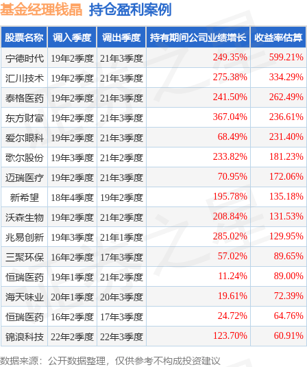 钱晶管理的平安创业板ETF基金在19年2季度买入宁德时代,在持有2年又1个季度后在21年3季度卖出。持有期间的估算收益率为599.21%,持有期间宁德时代在2019年到2021年的年报归属净利润增幅达249.35%。