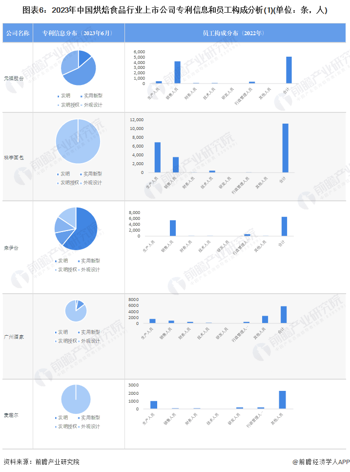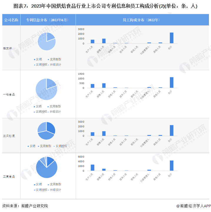 从烘焙食品行业的上市企业已有的公开信息分析,三只松鼠的专利数量较多,桃李面包、广州酒家等企业员工数量较多,桃李面包的销售人员数量也最多。