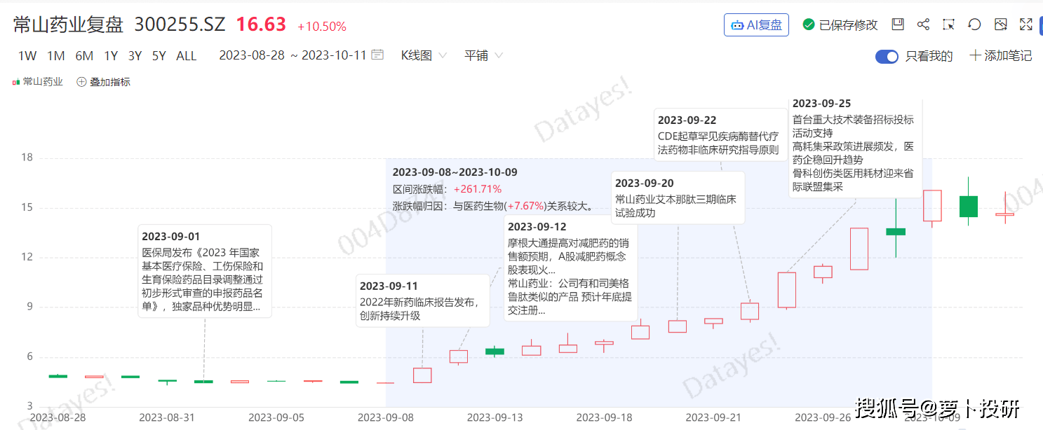 AI复盘上涨关键词:常山药业开展的创新药艾本那肽(GLP-1RA)的三期临床试验,与司美格鲁肤同属于GLP-1长效制剂,但实际试验并不涉及减肥与肥胖适应症。