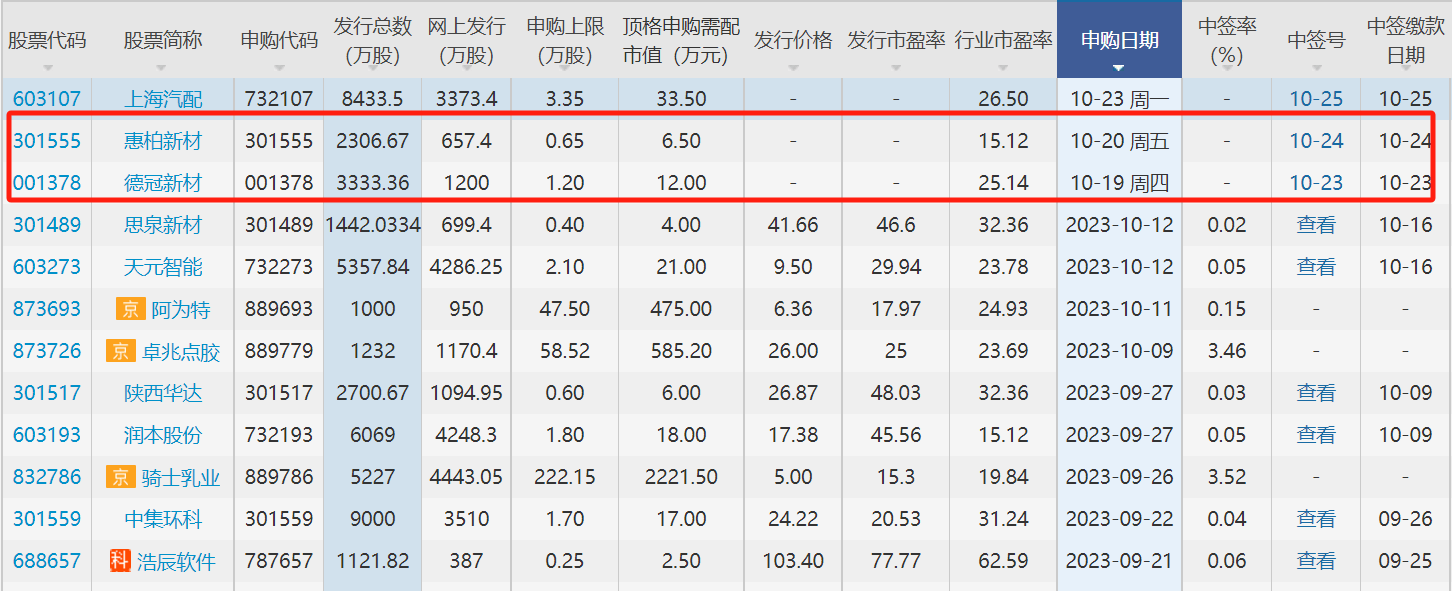 本周(10月16日-10月20日),共有2只新股将进行申购,分别为广东德冠薄膜新材料股份有限公司(简称“德冠新材”,001378.SZ)、惠柏新材料科技(上海)股份有限公司(简称“惠柏新材”,301555.SZ)。