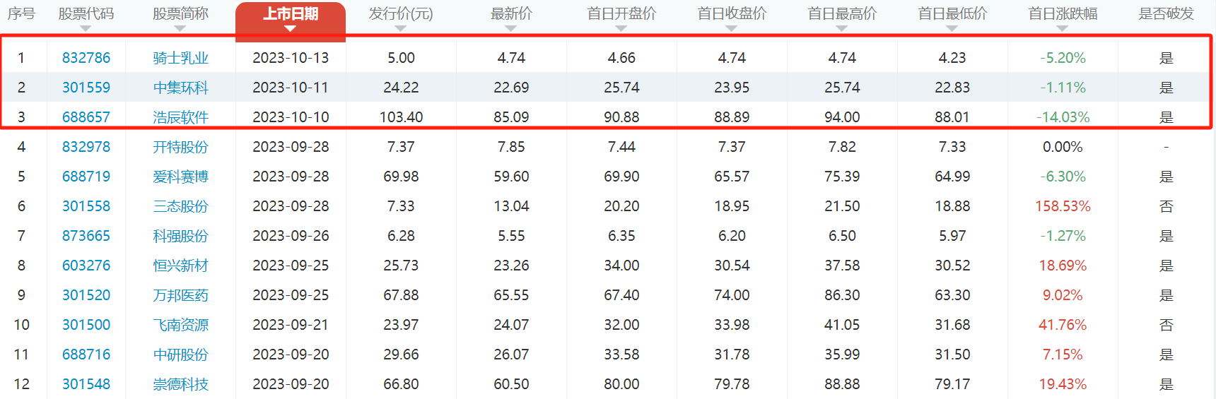 回顾上周(10月9日-10月13日),A股迎来了3只“新成员”。从上市表现来看,3只新股上市首日均遭遇破发,其中浩辰软件跌幅最大,超过14%,骑士乳业跌5.2%,中集环科跌1.1%。