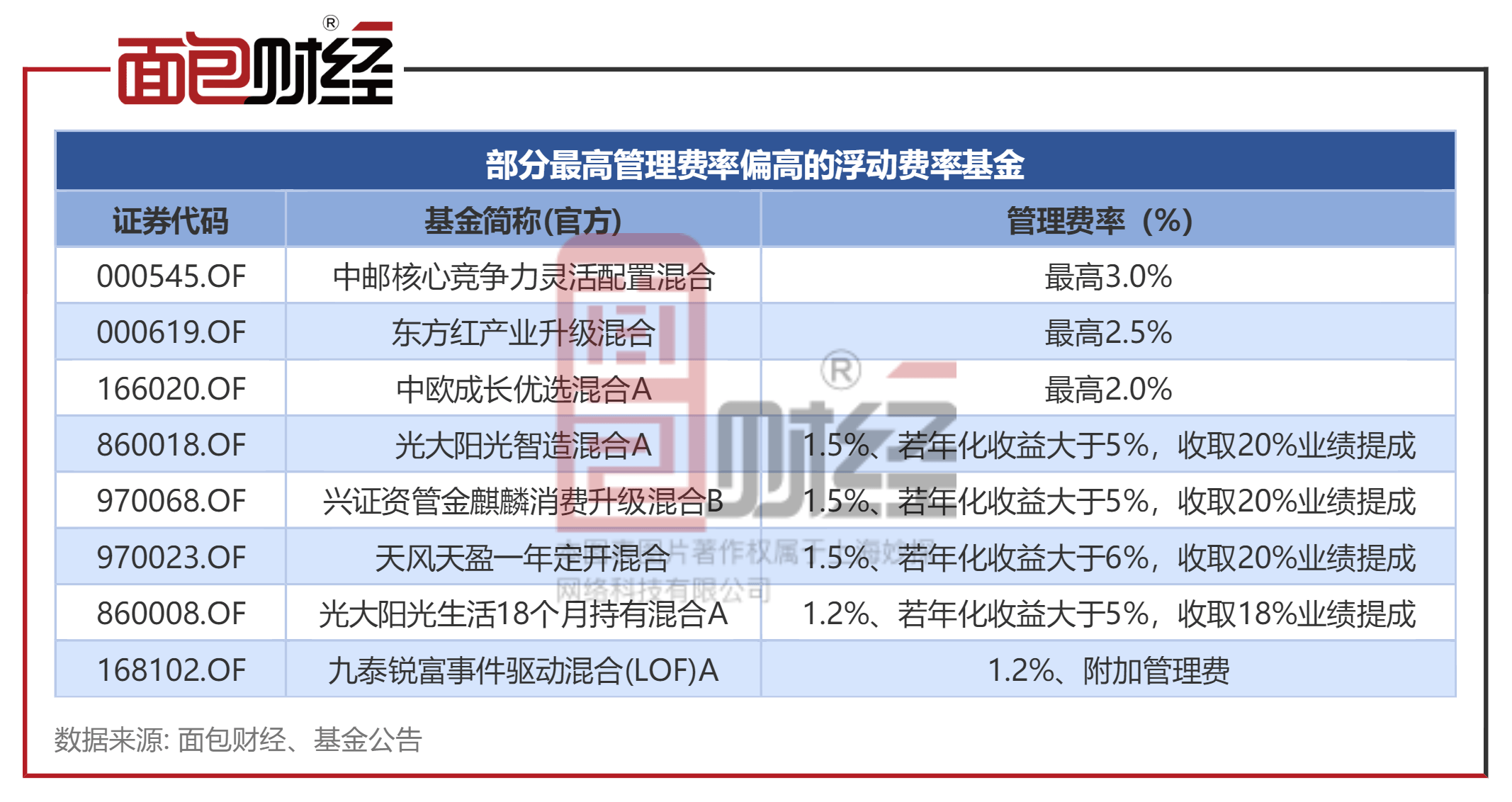 此外,多只浮动费率基金采用“固定费率+业绩提成”的模式。光大阳光制造混合A固定年管理费率为1.5%,业绩报酬为“年化收益超过5%以上部分收益”的20%。