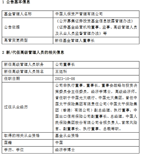 近日,资产管理有限公司发布基金行业高级管理人员变更公告,新任王廷科为公司董事长,任职日期2023-10-08。