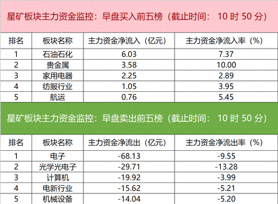 【主力资金监控:欧菲光净卖出超13亿元】财联社10月16日电,财联社星矿数据显示,今日早盘主力资金净流入石油石化、贵金属、家用电器等板块,净流出电子、光学光电子、计算机等板块,其中电子板块净流出超68亿元。个股方面,四川长虹涨停,主力资金净买入3.20亿元,新华制药、北汽蓝谷、同方股份获主力资金净流入居前;欧菲光遭净卖出超13亿元,赛力斯、冠捷科技、硕贝德主力资金净流出额居前。