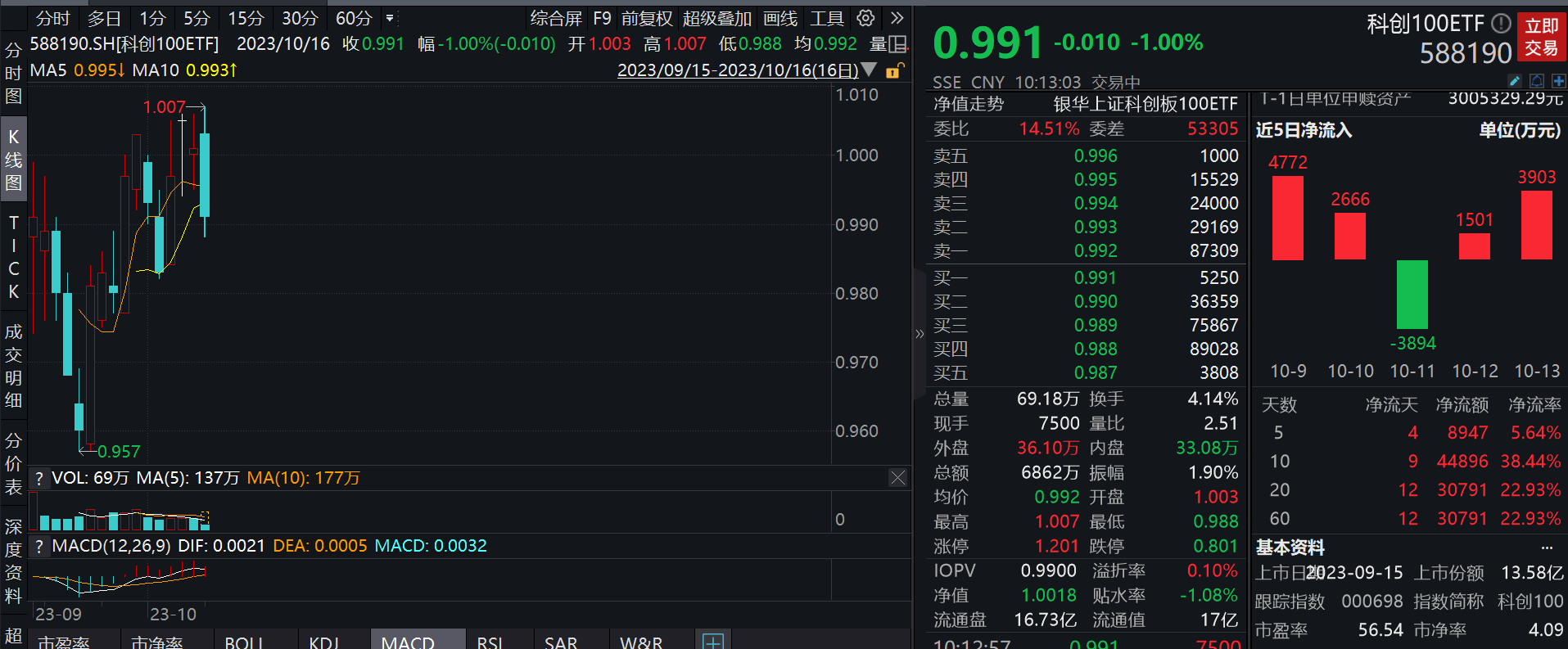 消息面上,科创100ETF(588190)已纳入两融标的。2023年10月14日,有关部门最新发布融券逆周期调整政策,在融券端,普通融券的保证金比例由50%提高至80%,对于私募机构的融券保证金进行差异化提升,即由50%提高至100%;在出借端,取消上市公司高管及核心员工通过参与战略配售设立的专项资产管理计划出借,适度限制其他战略投资者在上市初期的出借方式和比例。
