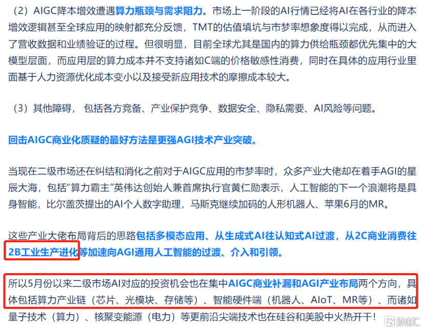 那么AI第二轮行情演绎会有何异同。正如我们5月28日在《AI投资新阶段:从AIGC商业化突破到AGI产业化加速》一文前瞻指出AIGC商业化的“算力瓶颈、需求障碍、技术突破、安全监管等”几大难题、以及提出重视算力链和AGI诸如智能终端(自动驾驶、机器人、AIoT、MR等)的产业布局机会: