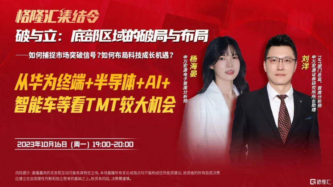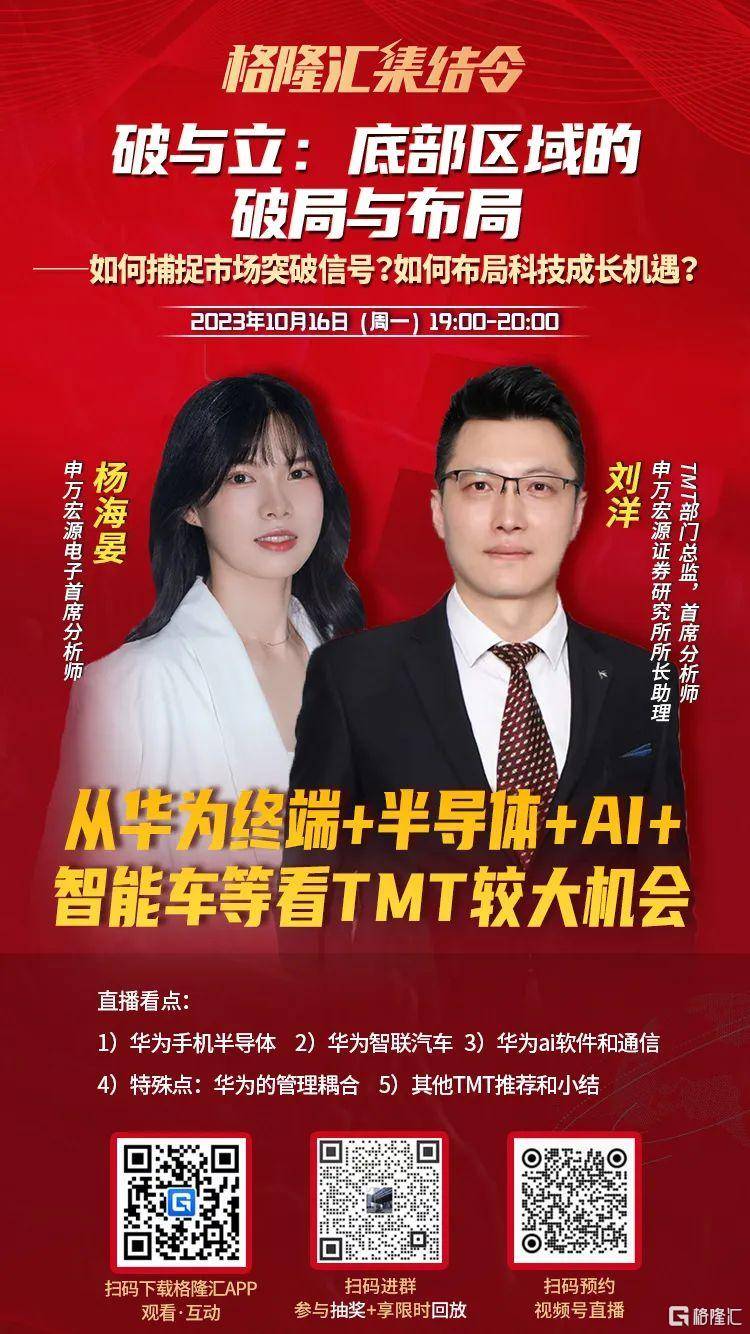 为更详细解读上述投资者关心的问题,格隆汇集结令特邀申万宏源证券研究所所长助理,TMT部门总监,首席分析师刘洋先生、申万宏源电子首席分析师杨海晏女士,于下周一晚上19点在各大直播间为投资朋友们带来全面详细的专业分享,欢迎大家扫码一键预约直播,准时收看参与抽奖和互动提问: