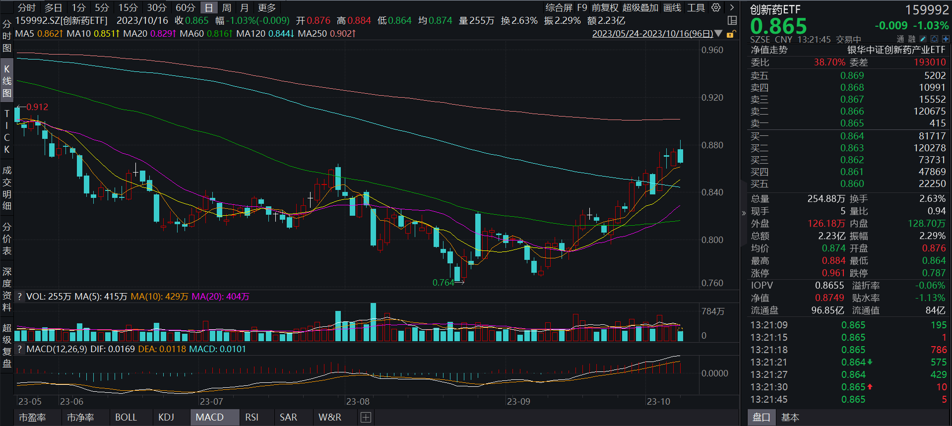 截至2023年10月16日13:21,创新药ETF(159992)成交额已达2.23亿元,回调1.03%,委比达38.70%,买盘活跃,成交额持续扩大,备受市场资金关注。