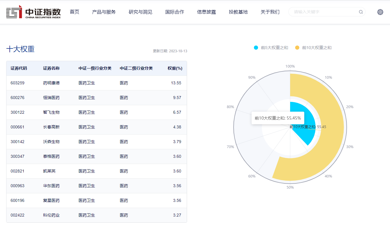 数据显示,截至2023年10月13日,该指数前十大权重股包括药明康德、恒瑞医药、智飞生物、长春高新、沃森生物等,前十大集中度为55.45%。(数据来源:中证指数公司,指数成份股不代表个股推荐)