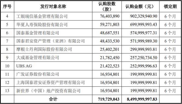根据《认购邀请书》关于确定发行对象、发行价格及获配股数的原则,发行对象依次按(1)认购价格优先;(2)认购金额优先;(3)收到《申购报价单》时间优先的原则确定。其中,招商局投资发展拟认购金额不低于1亿元且不超过20亿元。招商局投资发展不参与市场竞价过程,但承诺接受市场竞价结果,与其他特定投资者以相同价格认购本次募集配套资金发行的股票。本次发行最终获配发行对象共计13名,发行价格为11.81元/股,发行数量为719,729,043股,募集资金总额为8,499,999,997.83元。