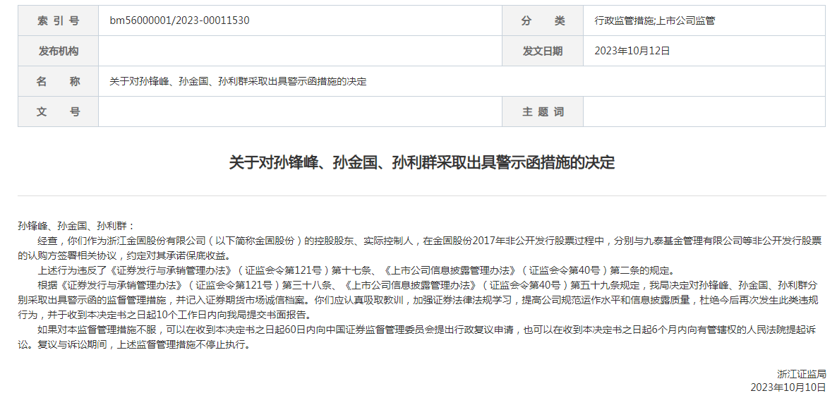 10月12日,浙江证监局也公告,经查,孙锋峰、孙金国、孙利群作为金固股份的控股股东、实际控制人,在金固股份2017年非公开发行股票过程中,分别与九泰基金等非公开发行股票的认购方签署相关协议,约定对其承诺保底收益。针对违规行为,浙江证监局决定对上述3人分别采取出具警示函的监督管理措施,并记入证券期货市场诚信档案。