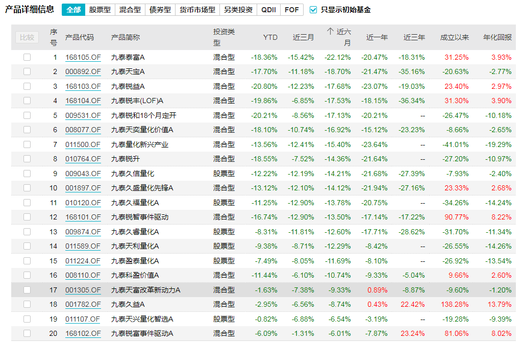 九泰基金一度因发展定增业务势头良好,2017年管理规模增长至近150亿元。在“老鼠仓”事件和市场行情的影响下,目前规模仅剩18.36亿元,旗下23只基金产品(仅计算初始基金)中,6只股基和16只混基近半年收益均为负,仅1只货基实现正收益。由于业绩不佳和规模缩水,近一年有3名基金经理离任。