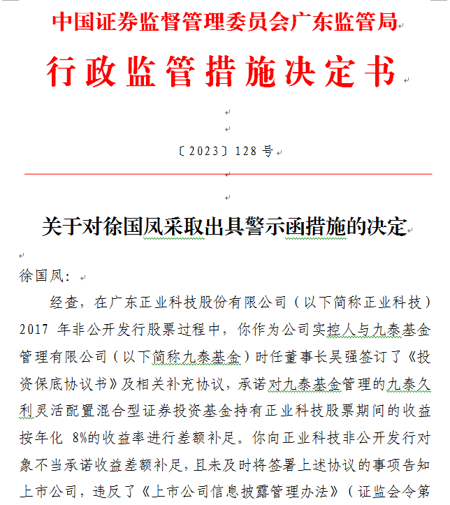 由于徐国凤向正业科技非公开发行对象不当承诺收益差额补足,且未及时将签署上述协议的事项告知上市公司,违反了相关规定,广东证监局决定对徐国凤出具警示函。