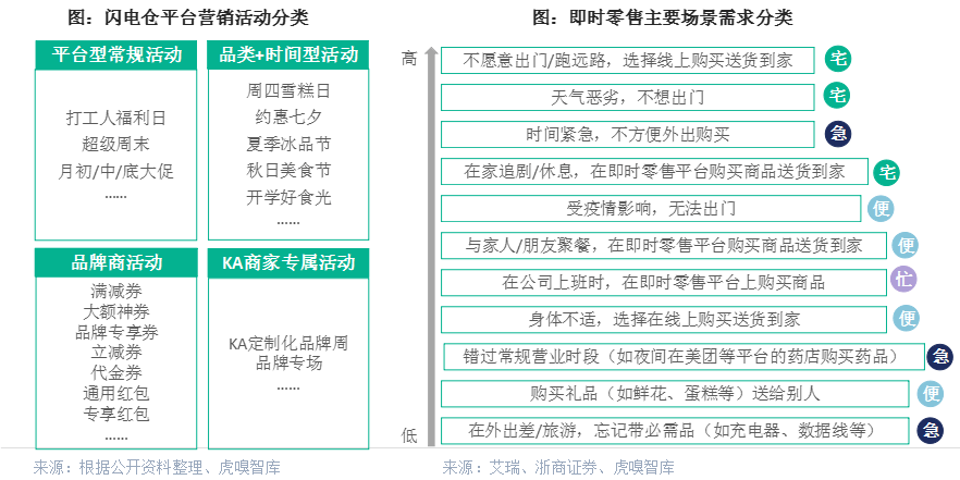 为更好地满足用户的便利购物需求,美团闪电仓运用品类+时间+场景的多维组合进行精准营销。平台根据用户的数据利用高曝光的营销入口吸引新用户,再根据不同场景需求推荐机会单品,组织针对性强的促销活动。