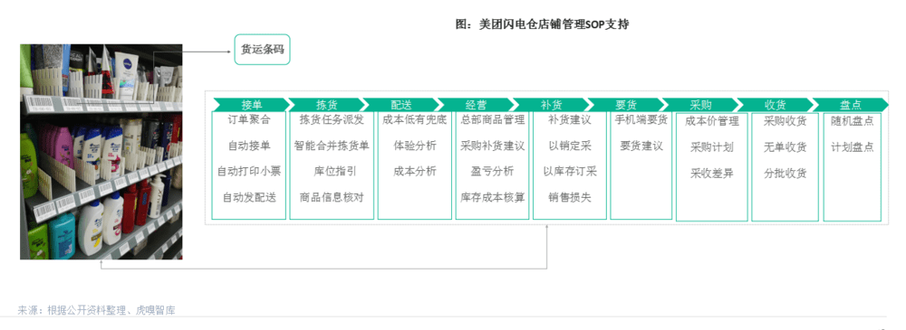 商家仓内作业标准化, 3分钟完成拣货。便利店经营,涵盖接单、拣货、配送、经营、补货、要货、采购、收货、盘点等多个环节。一般线下小零售店面临库存管不好、拣货拣不好等问题。美团闪电仓商家,借助于牵牛花系统解决库存管理问题,商家工作人员只需扫码取货,系统自动指导取货路径,大大提高拣货效率。在标准化作业流程下,平均每单拣货时间可控制在3分钟以内。