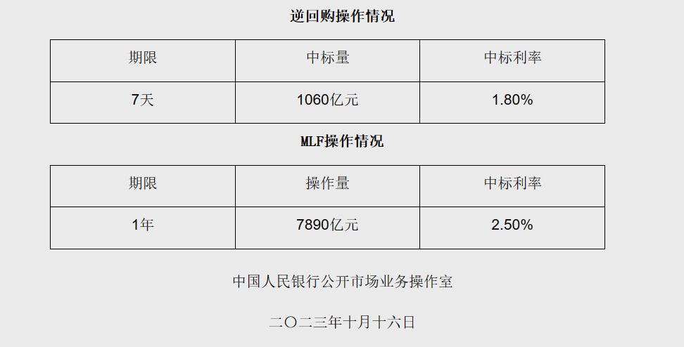 10月16日,央行网站公告称,为维护银行体系流动性合理充裕,今日开展1年期中期借贷便利(MLF)操作7890亿元,利率为2.5%,同上期保持一致。