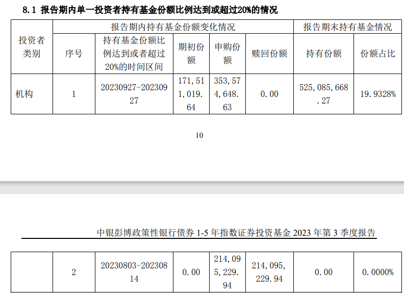 再看中银上清所0-5年农发行债券指数这只基金,三季度也出现了比较明显的申购赎回,其中三季度总申购接近7亿份,总赎回接近15亿份。虽然在持仓占比超过20%的投资者中,未见到机构是否在其中进行了申赎,但是从金额来看,不排除背后可能也有机构的身影。