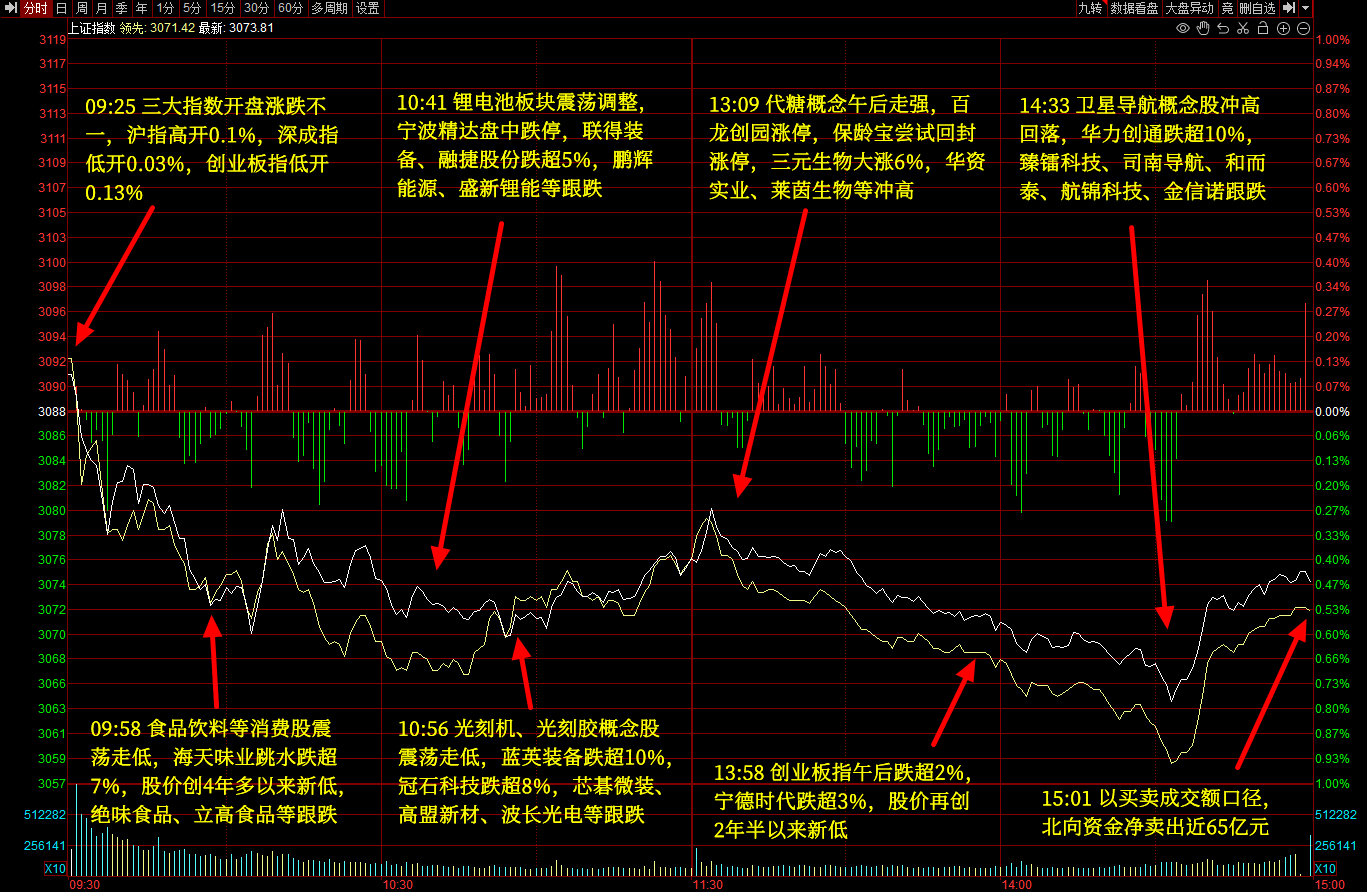 三大指数今日集体调整,创业板指午后跌超2%,创年内新低,宁德时代跌超3%,股价创2年半以来新低。油气股逆势大涨,通源石油20cm涨停,和顺石油、贝肯能源、博迈科、中曼石油、泰山石油、仁智股份等多股封板。ST板块走势活跃,*ST天山5天4板,ST天龙、*ST长方20cm涨停,*ST泛海、*ST西发、ST熊猫等多股封板。下跌方面,半导体产业链集体下挫,好上好、雅克科技、冠石科技跌停,商络电子、北京君正、蓝英装备跌超10%。大消费板块走低,海天味业跳水跌近8%。个股跌多涨少,两市超3400股飘绿,今日成交8129亿元。