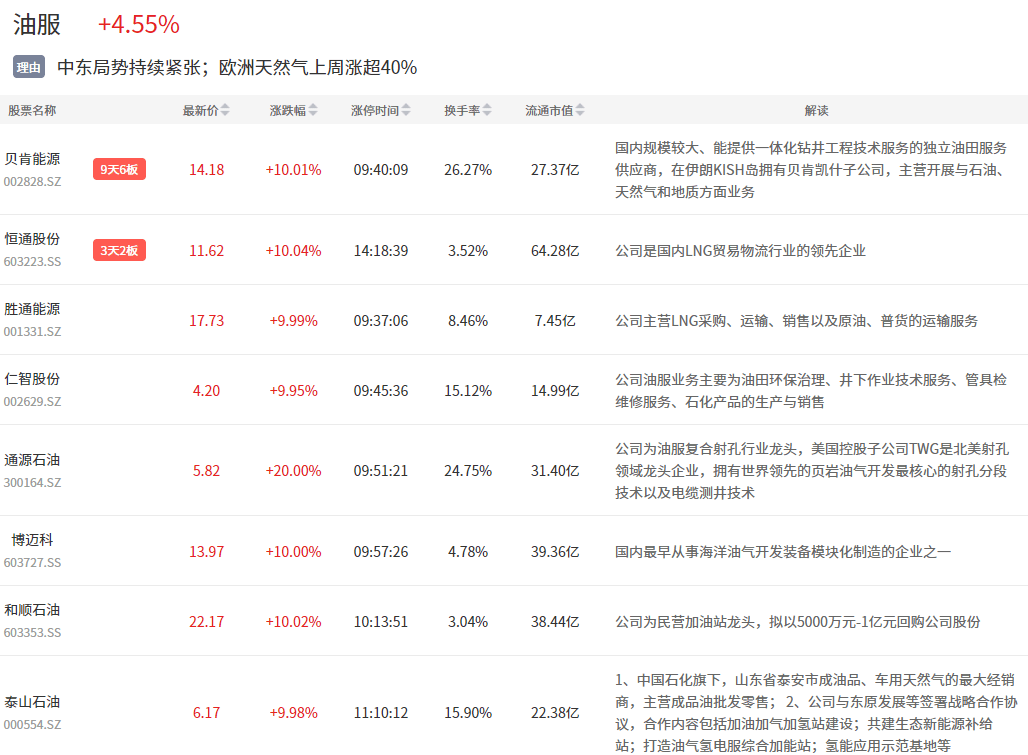 油服板块今日大涨,贝肯能源、恒通股份、胜通能源等多股涨停。