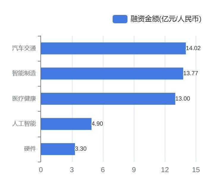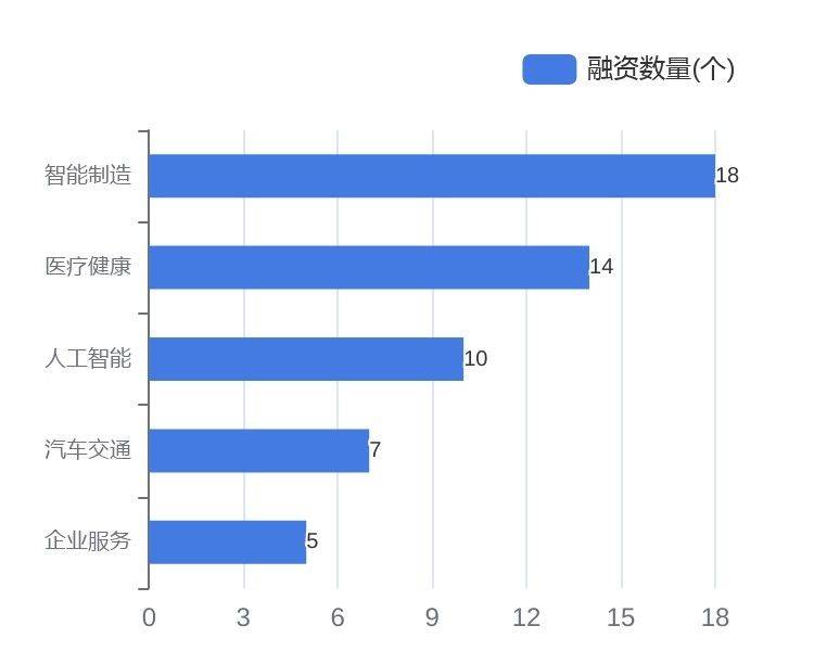 从融资事件数量来看,本周智能制造、医疗健康、人工智能领域融资最活跃。分别为智能制造18个、医疗健康14个、人工智能10个。