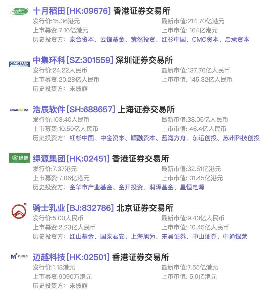 6家上市公司中,有4家曾获VC/PE或CVC投资,其中「十月稻田」曾获红杉中国、云锋基金、CMC资本投资;「浩辰软件」曾获红杉中国、中金资本、顺融资本投资;「绿源集团」曾获金开投资、金华市产业基金投资。
