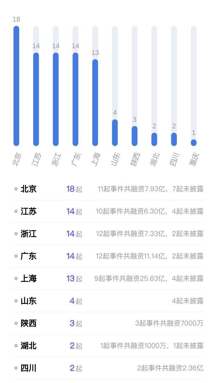 从本周披露获投企业的地区分布来看,主要集中在北京、江苏、浙江。其中北京披露18个,江苏披露14个,浙江披露14个。