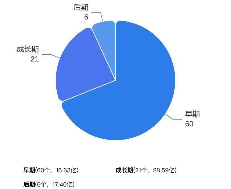 从本周披露获投企业的阶段分布来看, 早期60个、成长期21个、后期6个。