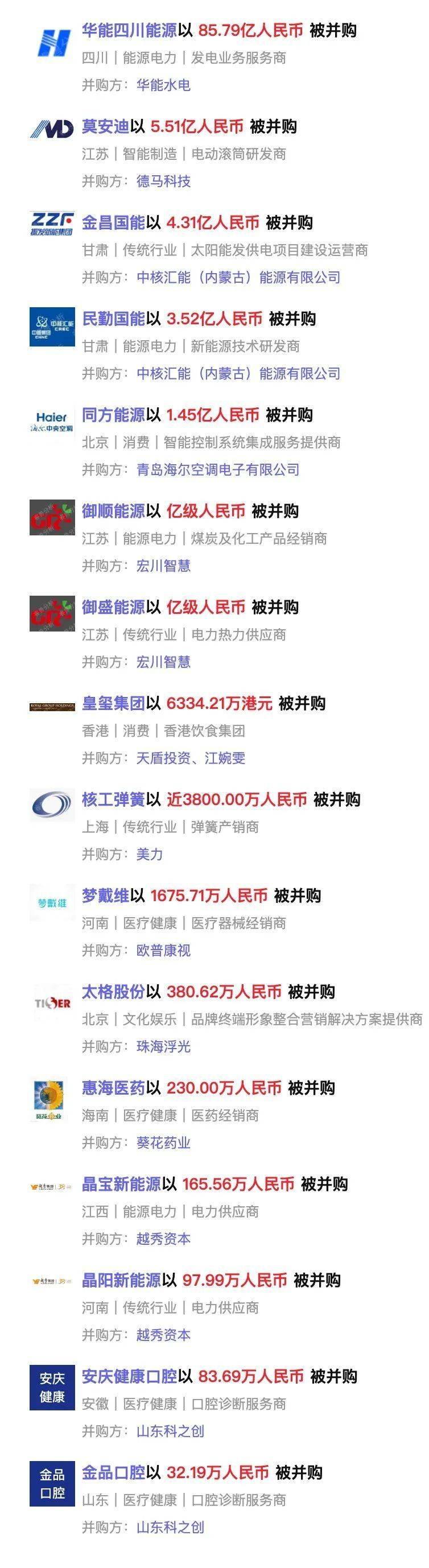 本周国内披露已完成的并购事件20个,分布在医疗健康、传统行业、能源电力行业。其中,华能水电以85.79亿人民币收购发电业务服务商华能四川能源100%股份。被收购方华能四川能源是一家发电业务服务商,涉及发电业务、输电业务、供(配)电业务、水力发电、新兴能源技术研发等业务。