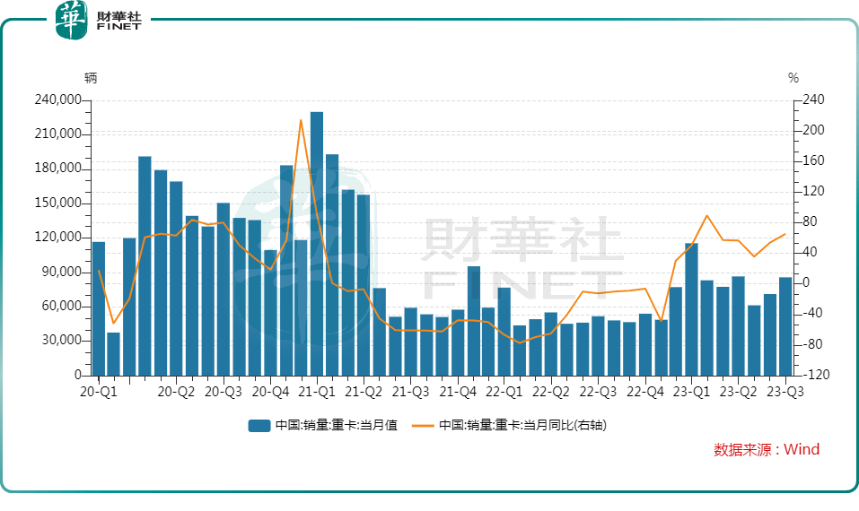 Wind数据显示,今年9月我国重卡销量约8万辆,环比增长12%,同比大幅增长55%,是今年1-9月以来第四个实现同环比“双增长“的月份。今年前三个季度,我国重卡市场今年累计销量已经超过去年全年67万辆的销量。