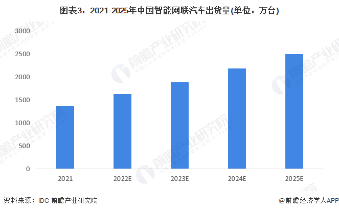 根据IDC数据,2021年中国智能网联汽车出货量达到1370万台。在国务院《交通强国建设纲要》与国家发改委《智能汽车创新发展战略》的推动之下,加之5G和智能网联技术迅速推广,以及消费者对汽车智能化接受度逐渐增高,智能网联系统在汽车产业内的装配率预计将在2025年达到83%的水平,出货量将增至2490万台,年复合增长率(CAGR)16.1%,发展空间十分广阔。