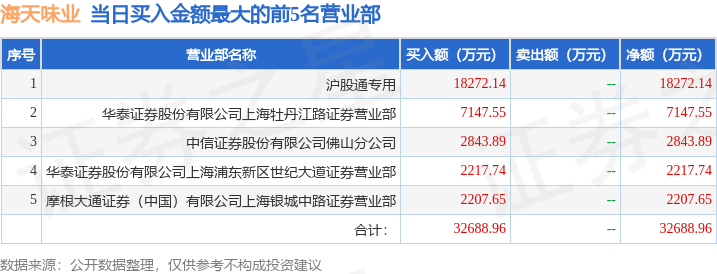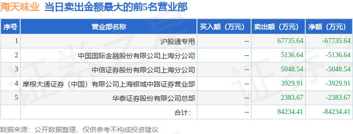 沪深交易所2023年10月16日公布的交易公开信息显示,海天味业(603288)因有价格涨跌幅限制的日收盘价格跌幅偏离值达到7%的前五只证券登上龙虎榜。此次是近5个交易日内第1次上榜。