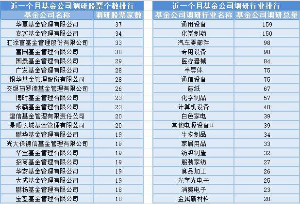 近一个月(9月16日-10月16日),华夏基金参与公司调研的数量最多,共调研37家上市公司,然后调研较为活跃的还有嘉实基金、汇添富基金、富国基金,分别调研34家、33家、30家上市公司;从调研行业上来看,基金公司对通用设备行业的上市公司调研次数最多,共有159次,其次是化学制药行业,基金公司调研了150次。