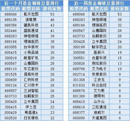 将时间周期缩短到最近一周(10月9日-10月16日)来看,基金调研数量第一的公司是航天宏图,属于互联网服务行业, 公司主要从事测绘服务;民用航空器(发动机、螺旋桨)生产;建设工程勘察;建设工程设计;互联网新闻信息服务;通用航空服务;国土空间规划编制,共被53家基金机构调研;然后被调研数量较多的股票是坤恒顺维、博瑞医药和山鹰国际,分别接受39家、32家和28家基金机构的调研。