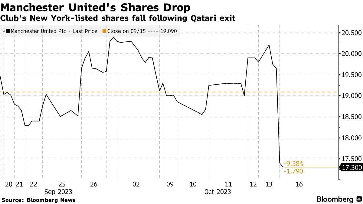 直播吧10月16日讯 据彭博社报道,卡塔尔财团退出收购后,曼联股价在周一盘前交易中下跌了22%。