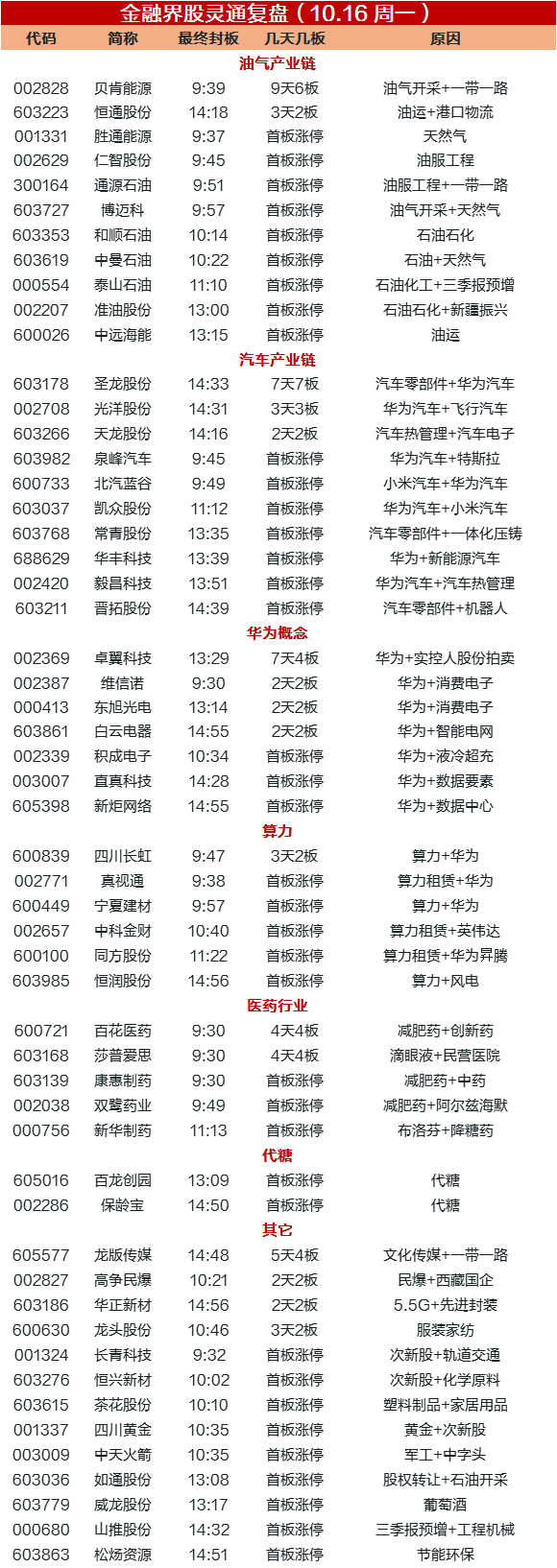 10月16日周一A股震荡下行,深成指、创业板指创年内新低,全A共54股涨停(不含ST股),12股封板未遂,连板股总数11只,圣龙股份(华为汽车)晋级7连板,百花医药(减肥药)、莎普爱思(滴眼液)4连板,光洋股份(华为汽车)3连板,东旭光电(华为概念)、维信诺(华为概念)、白云电器(华为概念)、高争民爆(民爆)、华正新材(5.5G)、天龙股份(汽车零部件)、龙版传媒(文化传媒)2连板。