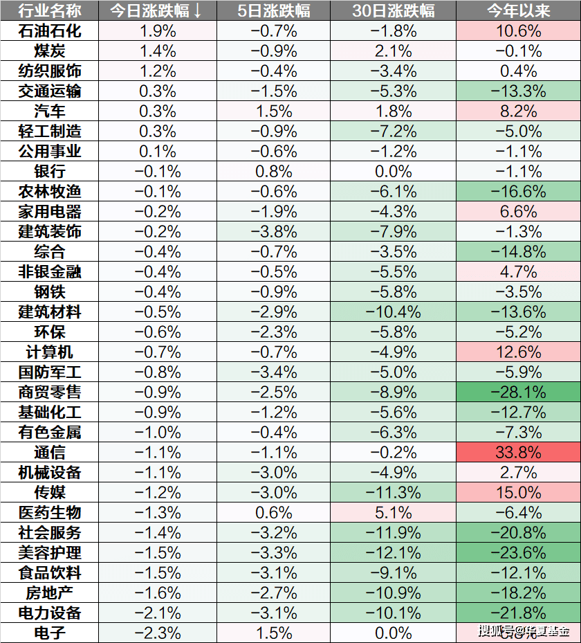 行业上来看,石油石化、煤炭、纺织服饰等板块领涨,房地产、电力设备、电子等板块下跌。