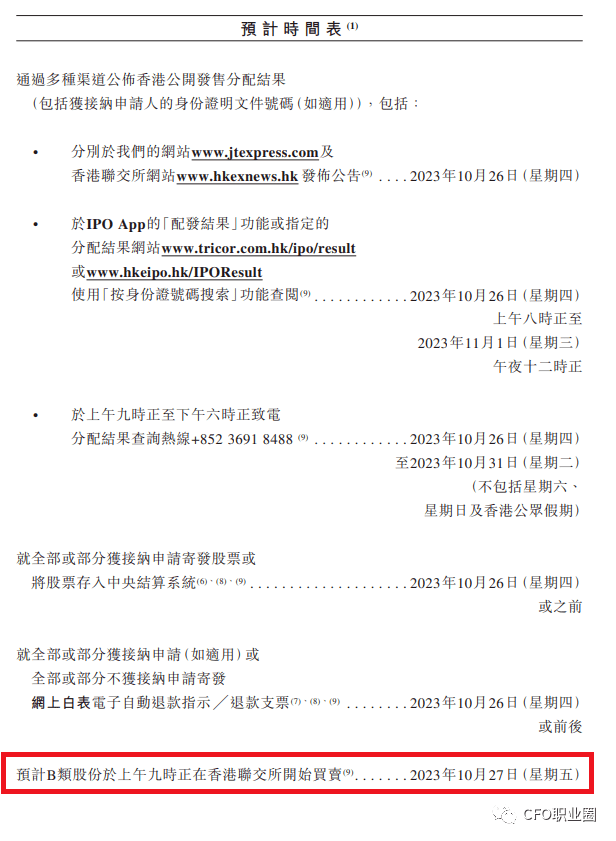 10月16日,极兔速递在港交所发布公告称,拟全球发售3.266亿股,香港公开发售占10%,国际发售占90%,另有15%超额配股权。发售价将为每股发售股份12.00港元,每手200股,预期B类股份于2023年10月27日上市。