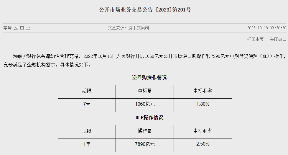 10月16日,为维护银行体系流动性合理充裕,人民银行开展1060亿元公开市场逆回购操作和7890亿元中期借贷便利(MLF)操作,7天期逆回购中标利率和MLF中标利率均维持不变,分别为1.80%、2.50%。