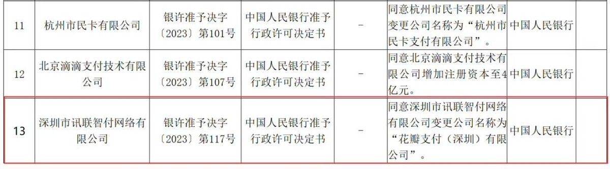 【环球网科技综合报道】近日,中国人民银行更新非银行支付机构重大事项变更许可信息,同意深圳市讯联智付网络有限公司(以下简称“讯联智付”)变更公司名称为“花瓣支付(深圳)有限公司”(以下简称“花瓣支付”)。