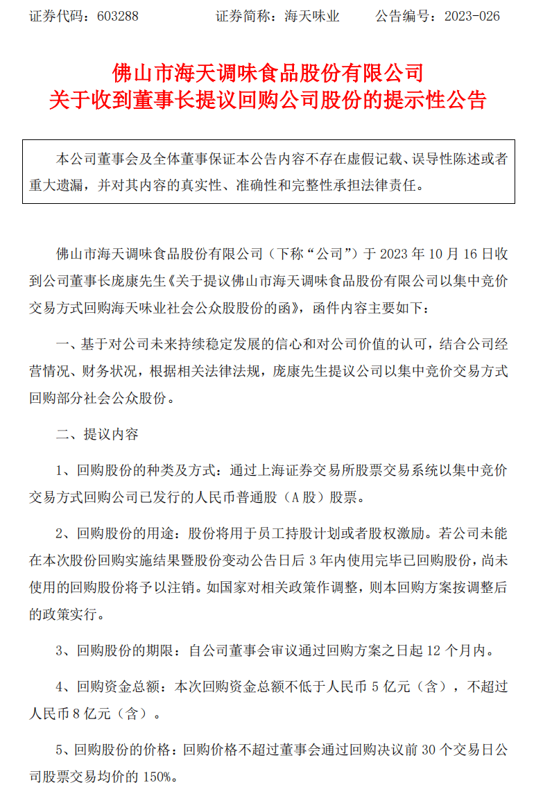 10月16日晚间,佛山市海天调味食品股份有限公司(下称“海天味业”,603288)公告称,收到一则公司董事长庞康发布的《关于提议佛山市海天调味食品股份有限公司以集中竞价交易方式回购海天味业社会公众股股份的函》。