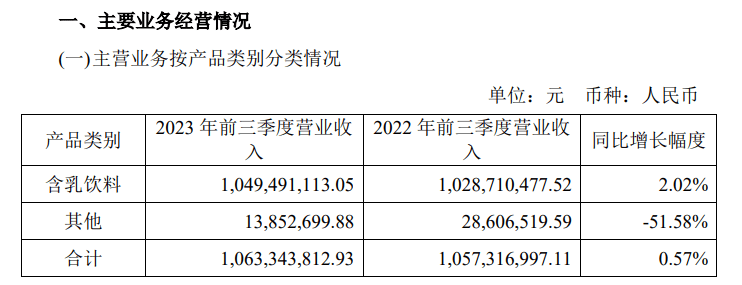 根据李子园给出的主要经营数据,含乳饮料在今年前三季度为李子园带来10.49亿元,同比增长2.02%;其他产品收入为1385.27万元,同比下滑51.58%。