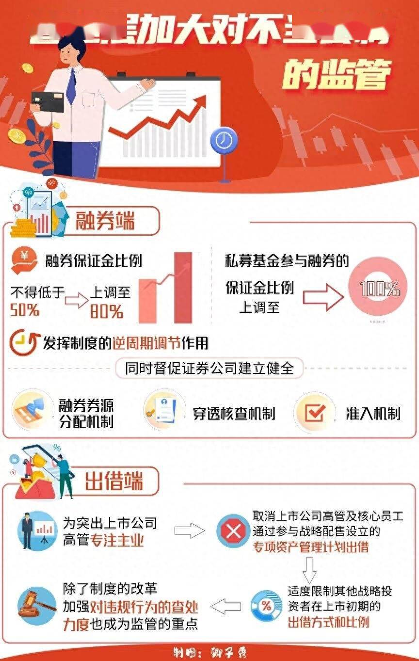 融券端,将融券保证金比例由不得低于50%上调至80%,对私募证券投资基金参与融券的保证金比例上调至100%,发挥制度的逆周期调节作用。同时督促证券公司建立健全融券券源分配机制、穿透核查机制和准入机制,加强融券交易行为管理。出借端,根据有关法规规定可以对战略投资者配售股份出借予以调整,为突出上市公司高管专注主业,取消上市公司高管及核心员工通过参与战略配售设立的专项资产管理计划出借,适度限制其他战略投资者在上市初期的出借方式和比例。