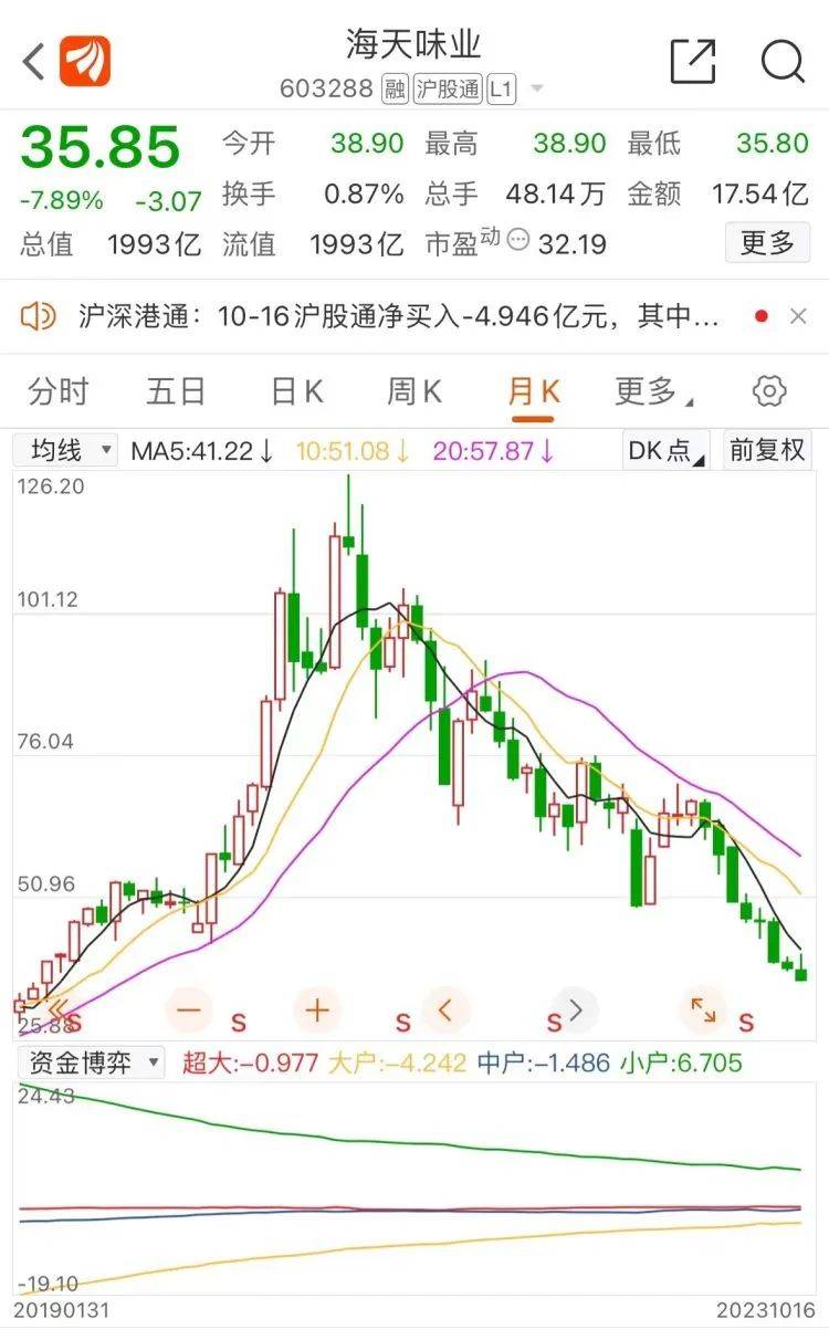 二级市场方面,今年以来,海天味业累计跌幅达45.48%。截至10月16日收盘,报35.85元/股,下跌7.89%,总市值1993亿元。全天换手率0.87%,成交额17.54亿元,振幅8.66%。龙虎榜数据显示,沪股通净卖出4.95亿元,营业部席位合计净卖出2081.94万元。