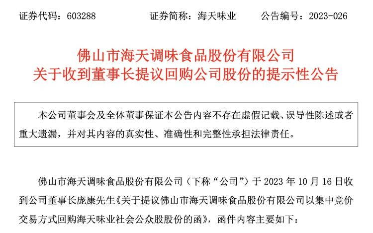 10月16日,调味品龙头、“酱油茅”海天味业(603288)股价遭遇“闪崩”,股价创4年半新低,当日晚间,公司发布关于收到董事长提议回购公司股份的提示性公告。