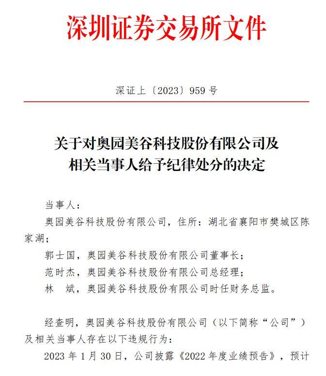 一、对奥园美谷科技股份有限公司给予公开谴责的处分;