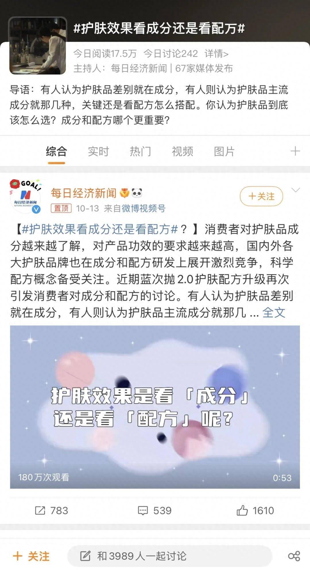 以护肤品行业为例,最近几年功能性护肤成为一个全新的赛道,就像护肤品一点点渗透进肌肤的过程,消费者们开始透过品牌精致的广告和产品包装,开始了解到产品具体的成分、配方,每天都有海量的相关博文、笔记发布,这些笔记通过搜索、点赞、评论又被放大和推荐到更多的消费者眼前。那么,当你面对这样一群更“专业”,更追求“功能性”的消费者时,在传播中加强对应的产品成分、配方优势,就变得极其重要。