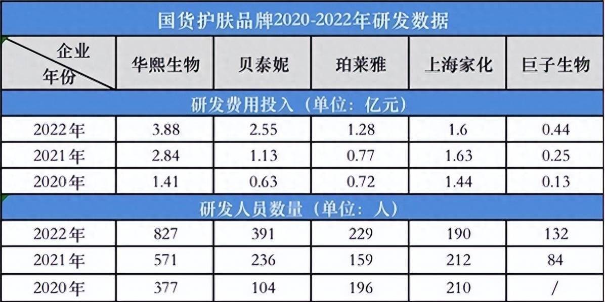 同时,国货化妆品的“顶流”华熙生物、贝泰妮、珀莱雅、上海家化、巨子生物等公司开始不断增加研发投入,研发费用率在财报中大幅攀升,也更愿意跟消费者讲述它们是如何做科研的。