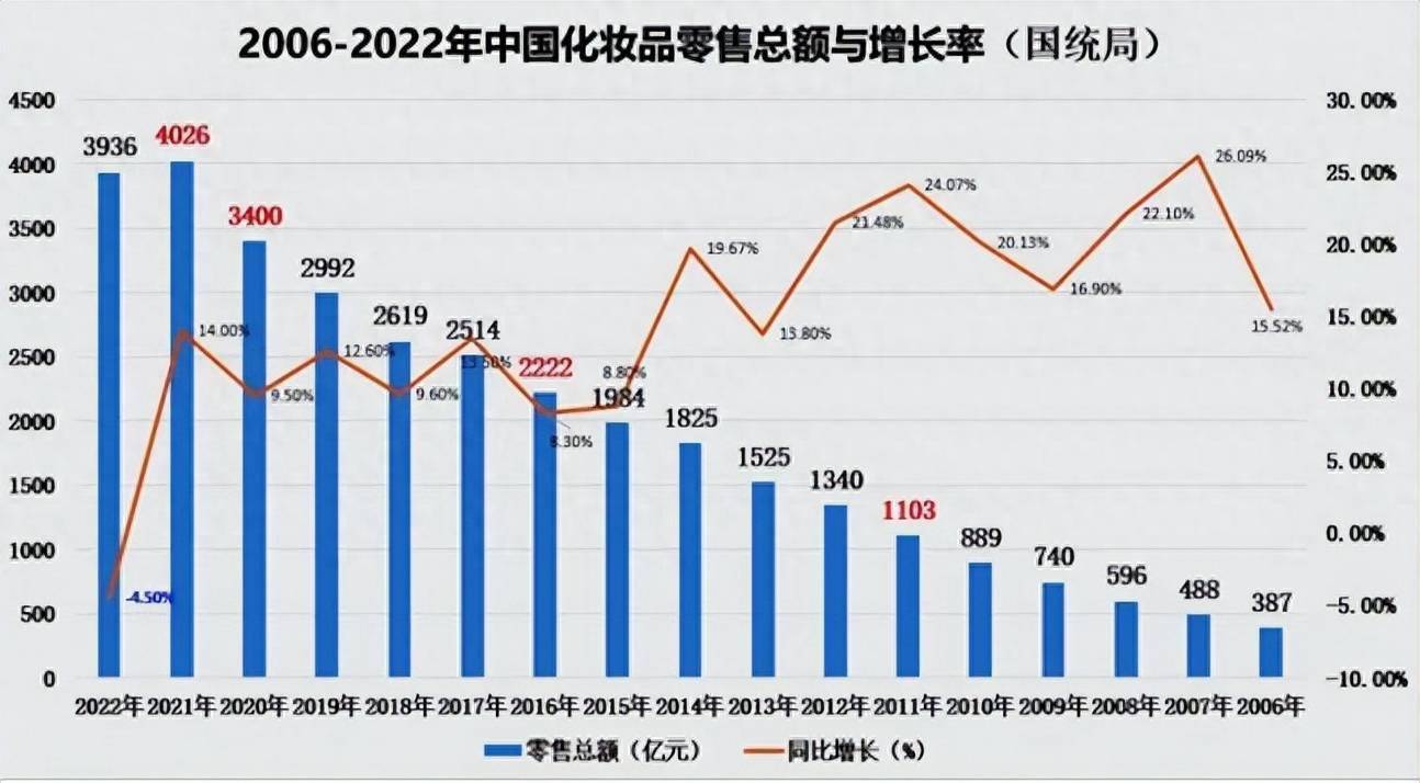 国家统计局数据显示,2018-2022年,全国化妆品零售总额从2619亿元增长到3935.6亿元。中国的化妆品及个人护理品市场份额,如今已成为仅次于美国的全球第二大市场。