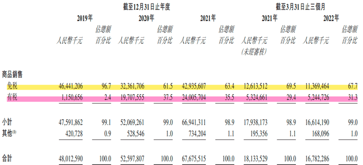 招股书解释,毛利率的下降主要是由于打折促销所致。但从收入结构来看,疫情以来,其免税商品销售收入减少,有税商品销售收入大幅增加。
